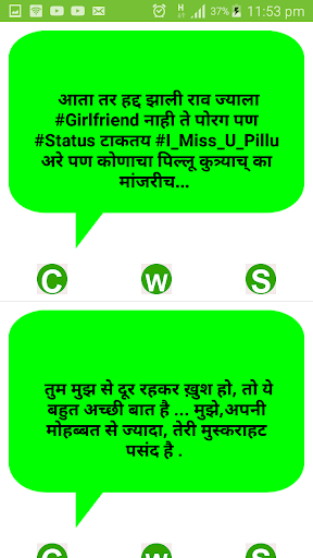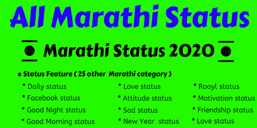 This app has good collection of Status, , shayari, Jokes, DP More. Easy share on social media. Add new collection Like Marathi love status, Marathi love Shayari, Marathi love sms. Get a daily latest Marathi Message to share with your friend. Daily Updated with Fresh and Trending Status Collection of Marathi .