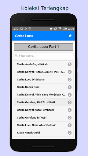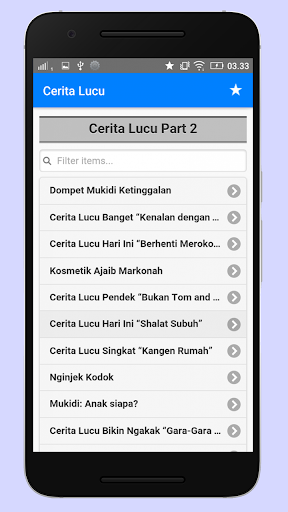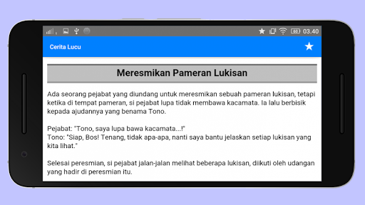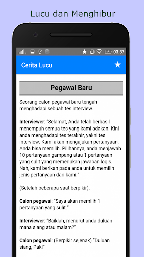 Aplikasi Kumpulan Cerita Lucu dan Humor Terbaru, yang Bikin Kamu 100% Ngakak. Berisi 1100+ koleksi cerita komedi jaman now yang kocak, konyol dan gokil abis. Cerita terdiri dari berbagai tema (mukidi, abu nawas, politik, dewasa, tebak tebakan, plesetan, jokes ringan, dll). Dijamin kece, keren dan bikin ketawa terbahak bahak. Aplikasi sepenuhnya offline dan tidak membutuhkan koneksi internet sama sekali.