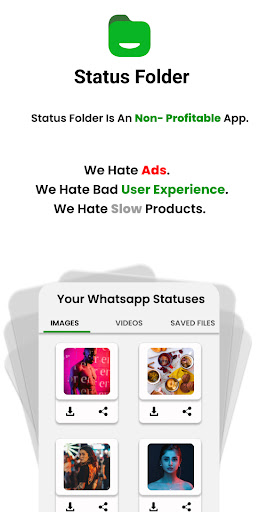 This status saver app is a quality product. Now its easy to save status, videos of any friends that you love the most. No need to ask him/her to send it to you. You can save from Status Folder.