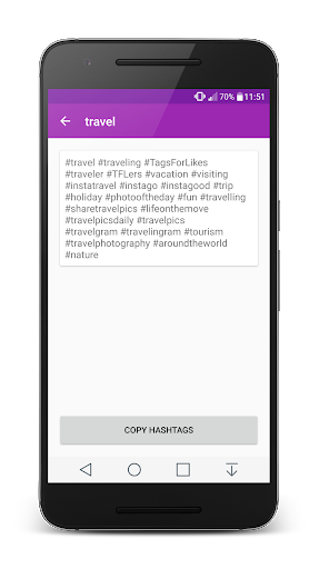 Simply choose a category for your post, tap 'Copy' to copy hashtags to your device, then open Instagram, Facebook or Twitter and paste on your pictures and posts.