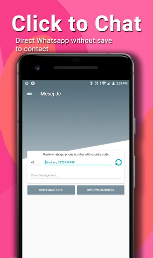 Mesej Je provides the user with a feature to direct whatsapp message without having the problem to save the phone number in their contact. Suitable for the user who does not have the necessity to keep a contact number (s). Added support WA Business.