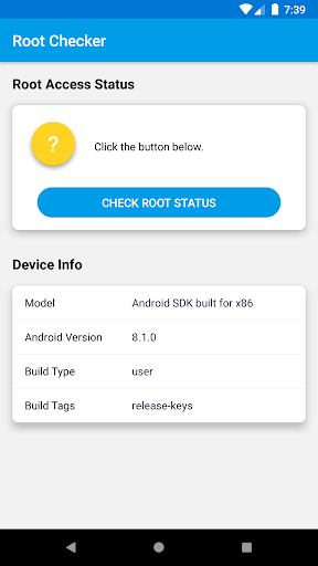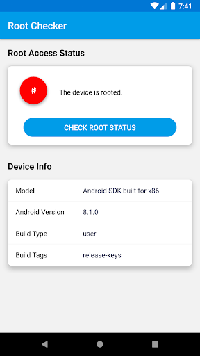 Root Checker is easy and fast to check if your device has root access. It also shortly provides your device info. 1. Model name 2. Android version 3. Build type 4. Build tags