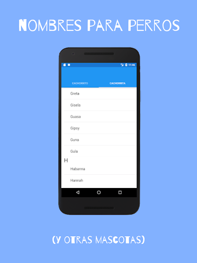 La app esta dividida en dos pestañas una para cachorros macho y otra para cachorritas hembra. Así podrás encontrar fácilmente el nombre ideal dependiendo si es un perro o una perra o un gato o una gata. Además los nombres están ordenados alfabéticamente.