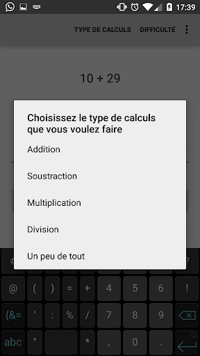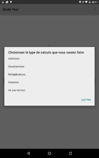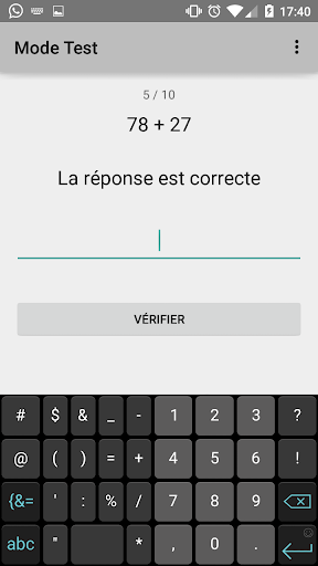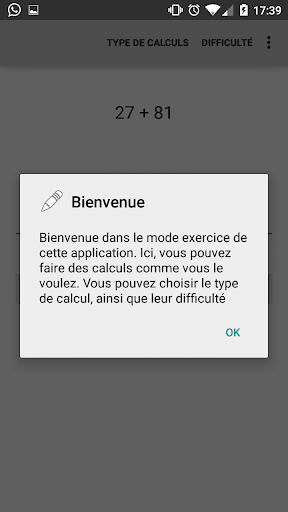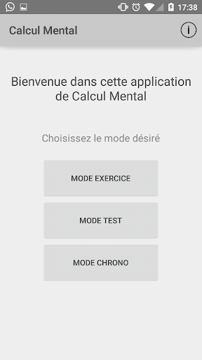 - Exercise Mode : Mode which allows to make calculations to infinity to train . You can choose between the followings modes : additions , subtraction, multiplication, division and " a bit of everything ". You also have the possibility to choose the difficulty between Easy, Medium and Hard. The application is able to correct you if the answer you entered is wrong .