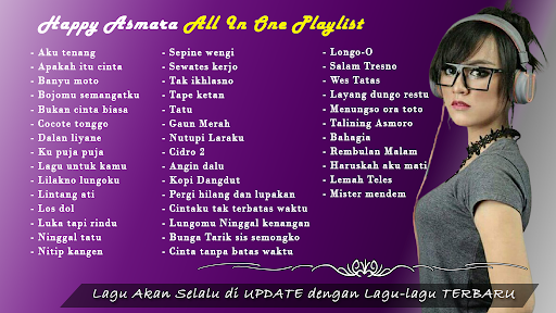 Berikut adalah senarai lagu-lagu Trends Happy Asmara yang terkandung dalam aplikasi ini, dan kami akan sentiasa mengemaskini dengan lagu-lagu terkini: