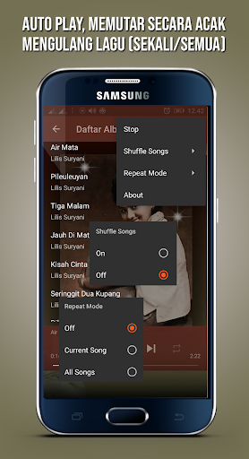 - Pilihan Memutar lagu secara acak (Shuffle) atau secara berurutan