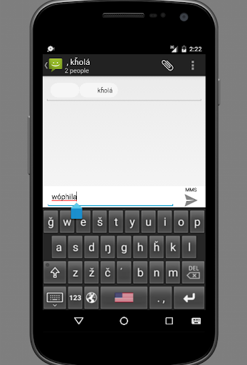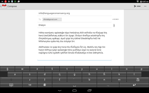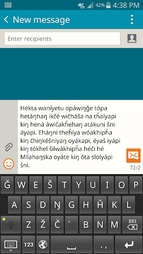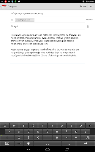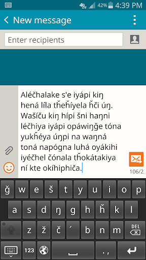 Once installed and selected as a keyboard option, you can switch between Lakota and English as you type emails, SMS, MMS, web content, and any other text-input field.