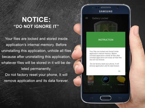 ii. Your files are locked and stored inside application’s internal memory. Before uninstalling this application, unhide all files because after uninstalling this application, whatever files will be stored in it will be deleted permanently. Do not factory reset your phone, It will remove application and its data forever.