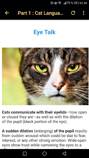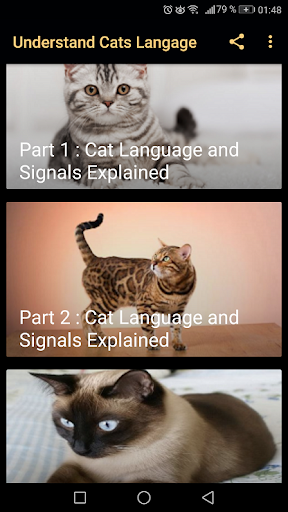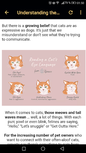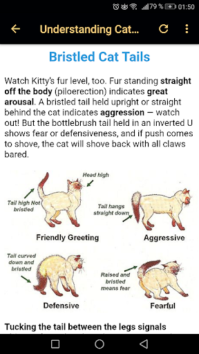 With this app, you will discover various Types of nonverbal Language in Cats. The silent semaphore language of cats is done via facial expressions and body positions and movements. A cat's eyes can show the inner feelings of the pet.