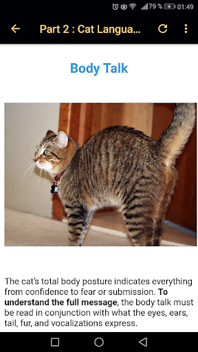 Our Cats Language tutorial give you the ability to read a cat mood in additional forms of body language. You will find in our app, a different ways in which the cat expresses his feeling through his ears, his emotions like curiosity and unease to restlessness or fear.