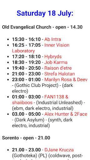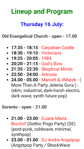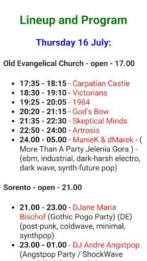 This App displays the Lineup for the Castle Party in Bolkow, Poland, on a single page.