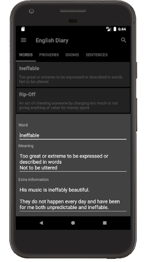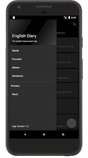 This application is developed just for improving English knowledge. All you need to do is to write down all the new words, new idioms, new phrases etc. which you find while reading or listening. Writing down will not be sufficient; you should do practice for memorizing also. You should also use added information while writing and speaking.