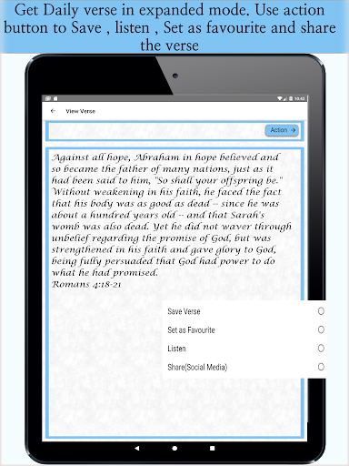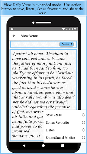 Get daily notifications on your phone in the morning . Read or Listen , set as favourite and share the bible verse with your friends and family.