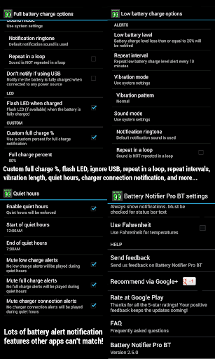 NOTE: Battery Notifier Pro BT is NOT 100% compatible with Android 10 and up. If your device has Android 10 or higher, it MAY or it may not work with your device. See our post at Battery Notifier News "Will original Battery Notifier work on Android 10 and up?" at http://batterynotifierpro.blogspot.com/