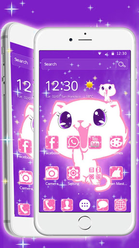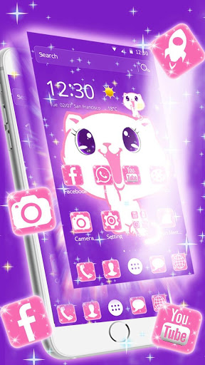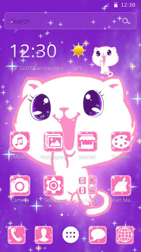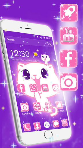 You can get Kawaii Cute kitty Cat Theme with pink tiffany love shiny kitty live wallpaper and cute bunnies lock screen and kawaii cartoon style icons pack! All app icons are in kawaii cartoon style to give you a special cute phone free. It is very cute cat cartoon theme with cute purple shiny cat screen wallpaper ! I love cute kitty Cat on weather widget and tiffany love clock widget . Believe you will love this Kawaii Cute Cat Theme to personalize android phone with kawaii cartoon style ! This cute kitty phone theme is a super choice for beautiful girl who like cute kawaii phone with cute kitties . We have been compatible with Samsung