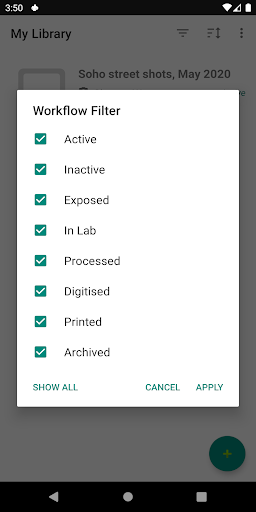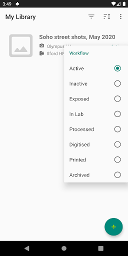 * Track workflow of your rolls and sets: Active, Exposed, In Lab, Processed, Digitised, Archived.