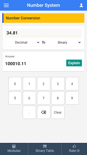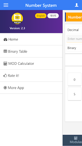 is a multi-lingual number system conversion app. You can easily convert one base to other bases easily. This app can convert decimal to binary, decimal to octal, decimal to hexadecimal, binary to decimal, binary to octal, binary to hexadecimal, hexadecimal to decimal, hexadecimal to binary, hexadecimal to octal. It's has a binary table where you can get 1 to 50 decimal to binary equivalent numbers. It's more useful features like MOD calculator & explanation of every number conversion.