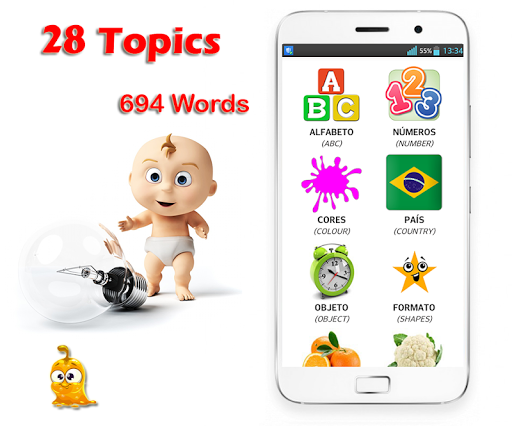 Learn Portuguese Brazil for Kids has 28 topics which are around real life, 768 words vocaburaly with sound and images of them . You can use all of them without network, it’s for Kids.