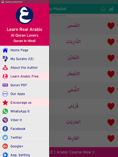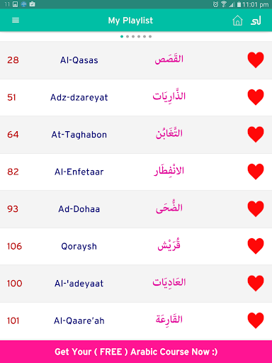Main screen is featured with entire Quranic Surahs with customized settings which contain: