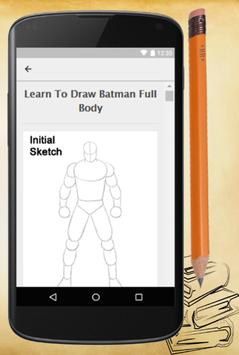 Learn To Draw The Bat-Man is an app that teaches you how to draw Batman full body, face, the dark night, and more step by step. This app is a fun activity for teaching your kids. It's simple steps allow you to perform fantastic drawings, just take a paper and a pencil. It is very easy to use. Please Download this Learn How To Draw Batman App and enjoy now.. Thank you...