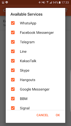 The app currently supports the following services: Whatsapp, Messenger, Hangouts (requires Android Wear to be installed), Line, Kakaotalk, Telegram, BBM, Signal, Textra, Chomp, Android Messages.
