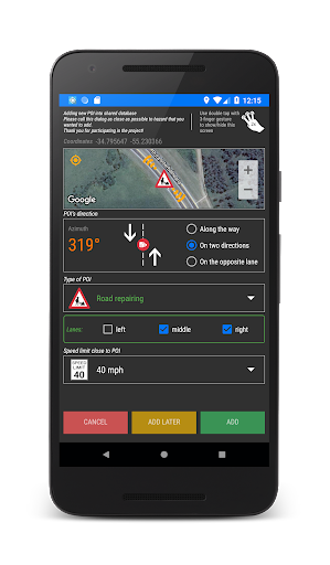 Speed Camera Radar application was created for drivers to detect hazards on the road, such as speed cameras (mobile ambush, static speed cameras, red light cameras), speed bumps, bad roads and etc.