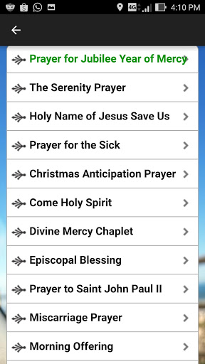 Jubilee Year of Mercy, The Serenity Prayer, Holy Name of Jesus Save Us, Christmas Anticipation Prayer, Come Holy Spirit, Divine Mercy Chaplet, Episcopal Blessing, Holy Rosary, Saint John Paul II, Miscarriage Prayer, Morning Offering, Before and After Mass, Thanksgiving for Mass, Prayer for Employment, For Our President and Public Officials, For Help Against Spiritual Enemies, For Life, For Life Throughout the Year, For the Unborn, For Travellers, For Victims of Hurricanes, For Vocations, Prayer of Abandonment, Prayer to End Abortions, Short Prayer, Spiritual Pilgrimage With Pope Benedict XVI, Te Deum, For Peace, For Safe Journey, Before Exam