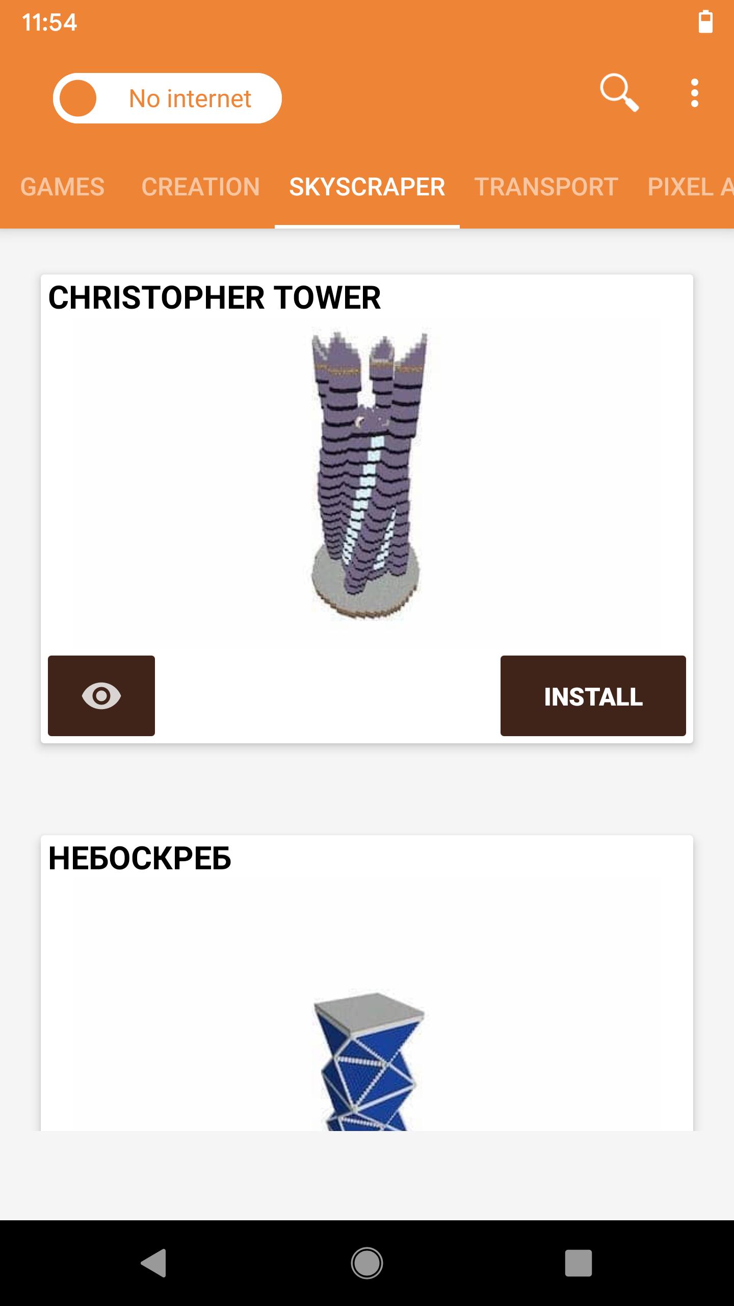 Install buildings right on your Minecraft map! There are many categories: houses, mansions, medieval, creations, ships, castles, pixel-arts, statues. This builder will build objects automatically, so you don't need to spend many hours using instructions. Object will be on the exactly that place that you want - adjust position using 3D viewer. Out of building ideas? Just download huge skyscraper and show it to your friends! Add your creations and transfer them between worlds. Create a map of your dream with the best buildings from other maps!