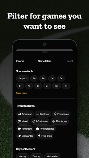 We offer: 11v11 football, 7v7 football and 8v8 football for men, women and mixed players. Artificial turf. We also offer 6v6 and 5v5. 1 hour of football.