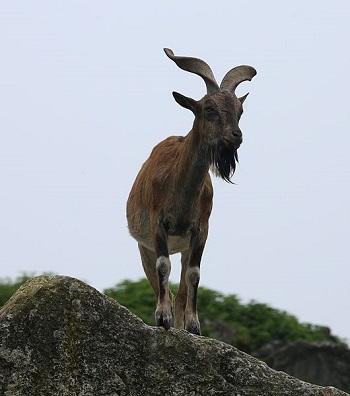 The Markhor is a large species of wild goat, found in countries like Afghanistan, Pakistan, northern India, and the Himalayas region. It is also called the Screw Horn Goat and is the national animal of Pakistan. Markhors can weigh from 32 to 110 kg and have a coat of fur with light brown to black colour. Both male and female markhors have horns that look like corkscrews. The markhor is well-adapted to mountainous regions.