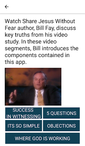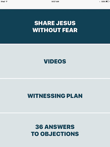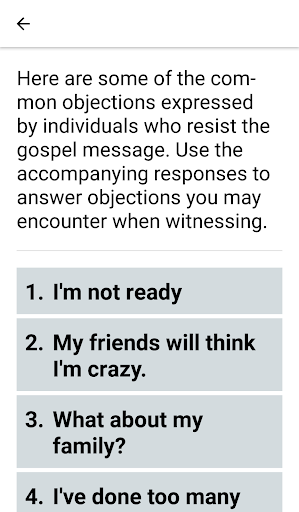 A simple, relational way to witness about Jesus Christ. Depending on God’s power for the results, this approach lets the Bible speak for itself. Believers can access the Bible by touch to easily navigate a witnessing conversation in everyday situations. This app includes 36 responses with scriptures to help answer the most common objections a nonbeliever may have about the miraculous power of God to change and save lives through a personal relationship with Jesus Christ.