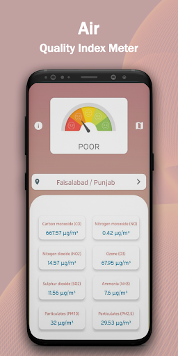 Air pollutants are displayed in detail such as carbon monoxide (CO), nitrogen monoxide (NO), nitrogen dioxide (NO2), ozone (O3), sulphur dioxide (SO2), fine particles matter (PM2.5), coarse particulate matter (PM10) and ammonia (NH3). Values are displayed also in red (above) or green (below) the limits.