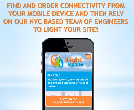 Light My Site is a free app and does not ask for registration in order to see the proprietary information around which ISP’s are lit in your building. In addition to allowing users the ability to order connectivity without ever having to call or speak with a cable or internet providers directly, we are a New York City based team of provisioning and engineering specialists that give users real-time updates on order placement, installation timeframes and carrier due dates, all from the convenience of the Light My Site app on your smartphone.
