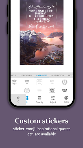 Type text on image app helps you to express yourself. Add words to photos and let your friends and followers know what is in your mind. Put your favorite quotes or motivational texts on photos and share your thoughts. Turn your boring pictures into vibrant images using our fantastic photo text editor. If you have always wondered how to write text over photo in the easiest way, put text on pictures app is the answer.