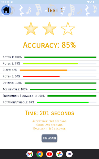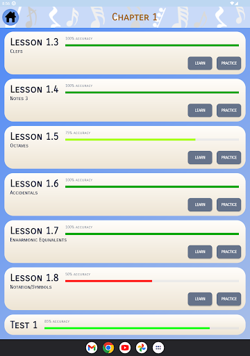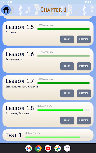 Test: Check your understanding on each chapter with questions selected randomly from each lesson. Each question is asked once regardless of your answer. The app gives you feedback on your overall accuracy, accuracy for each lesson, and time taken after you finish.