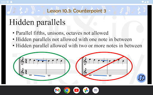 Learn: Watch a short video explaining a concept, such as major scales or species counterpoint.