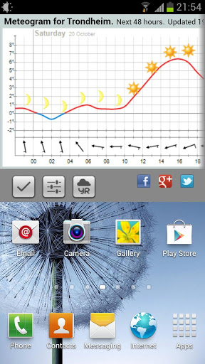 Touch the widget to show the meteogram, a detailed graphical display of the forecast for the next 2 days. Touch the update icon (2 arrows) to manually update position and forecast.