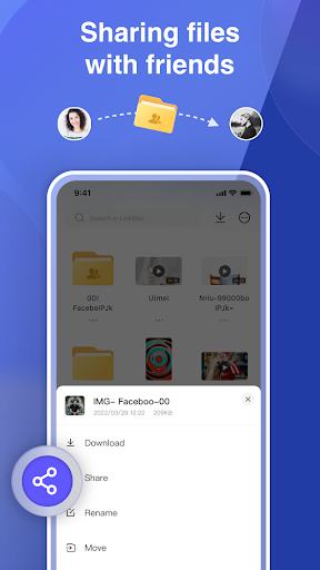 By sharing you can make files available to anyone. You can share files, photos, videos with friends and family. At the same time, it supports entering the shared folder, so as to obtain any files such as videos that are updated at the same time in other people's folders.