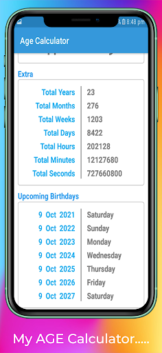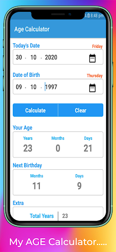 This application offers a simple, easy-to-use user interface. Just select your Age Calculator birthday and give your total age and next birthday to the next birthday.