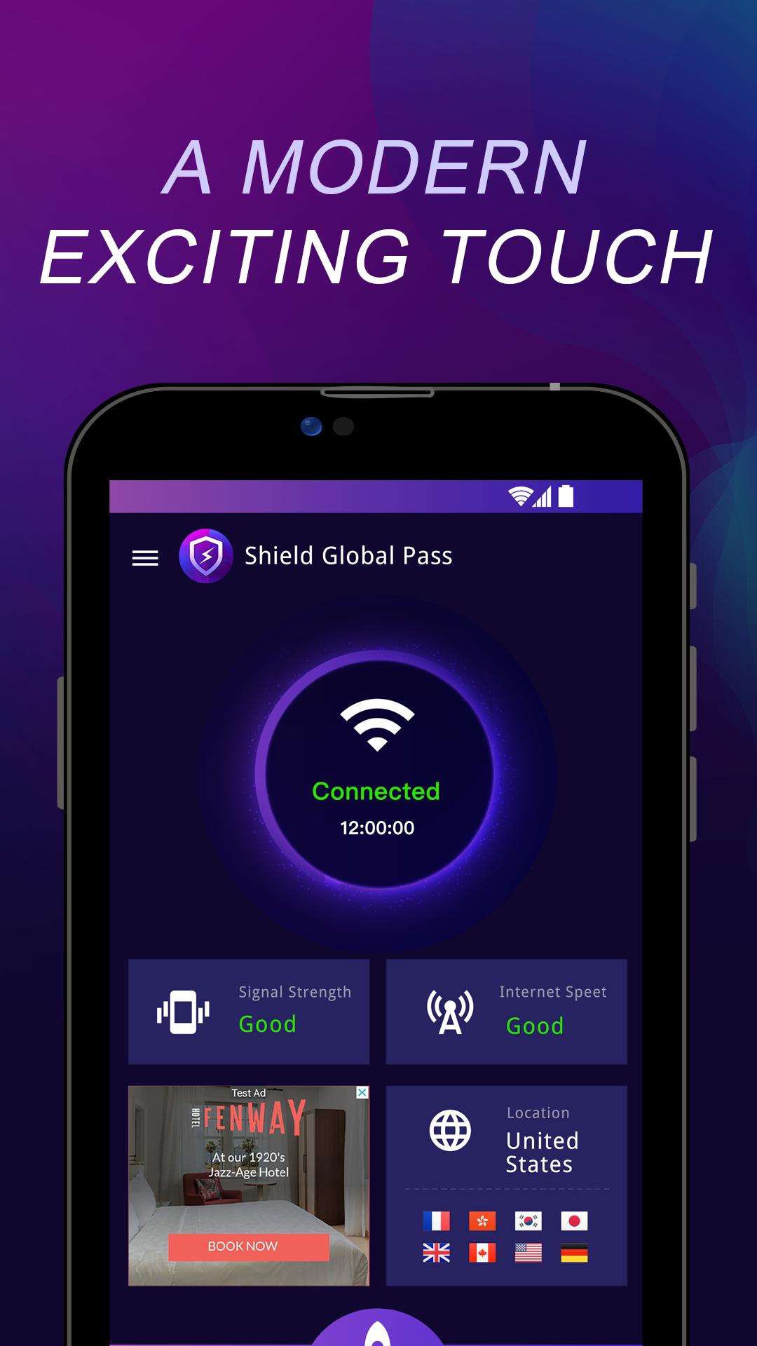 Shield Global Pass is a secure and fast VPN. Secure WiFi hotspot, access blocked websites and apps, watch videos (streaming content/ movies/ sports programs/ any other shows), accelerate games and bypass firewalls.
