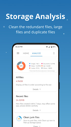 1. Analyze internal storage, clean up empty files, empty folders, log files, temporary files, cache files, redundant files, duplicate files, and large files to free up storage space.