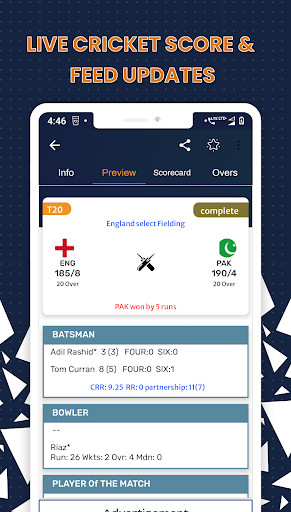 • Never miss a ball by ball commentary. Get detailed information about every ball delivered.