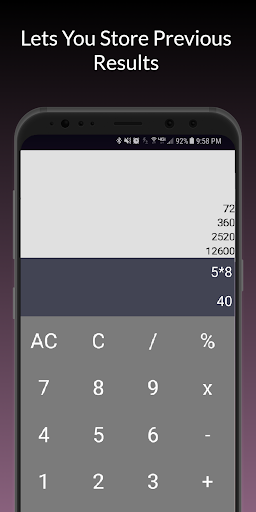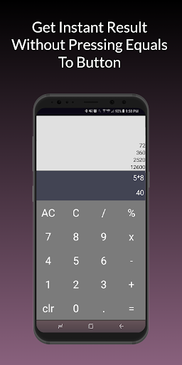 This calculator is first of its kind on Play Store which allows you to instantly get result without pressing the "Equals to ( = )" button. While also allows you to store recent result by pressing equals button.
