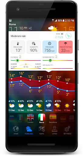The unique weather forecast algorithm has access to thousands of weather stations. It allows making a mostly accurate forecast for each location around the world!