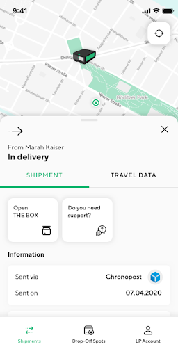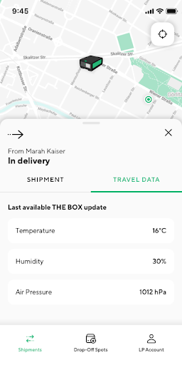 The LivingPackets BOX application gives you full control over all your shipments. Whether you are receiving or sending you can follow the location of your shipment, get updates on temperature, humidity, air pressure, unauthorized openings, forces acting on your parcel and more.