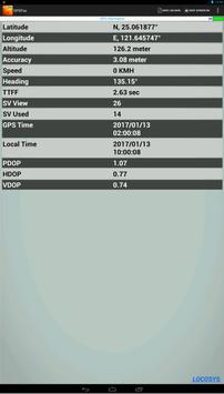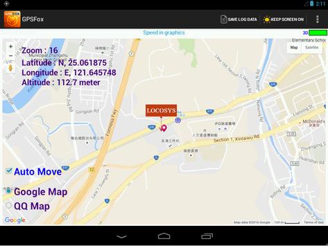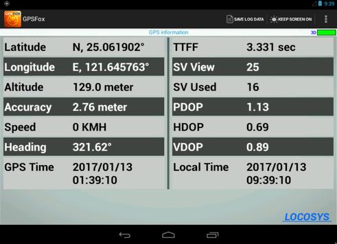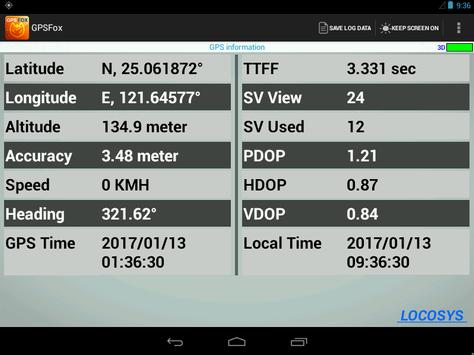This App is an easy-to-use GPS software developed by Taiwan based LOCOSYS Technology Inc. User can see GPS status from their Android devices. The App supports worldwide GPS/GLONASS/GALILEO/QZSS/BEIDOU systems, basic GPS information (Latitude/Longitude/Altitude/Heading/Accuracy/TTFF/GPS time/Local time are available) and user can save NMEA log data for further analysis. Different speed units are supported; satellites distribution and signal strength can be enlarged for personal preference. With internet access, user can also get current location and display on the map. Learn more about LOCOSYS: www.locosystech.com