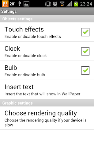 You can enter a text that will be displayed in the home, play with the letters, or watch the time going away or if you're in the dark you can turn on the flash device directly from the background!