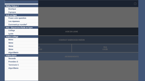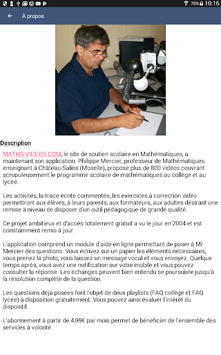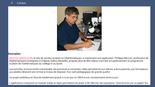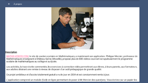الرياضيات - مقاطع الفيديو، موقع دعم المدرسة في الرياضيات، لديها الآن تطبيقها. يقدم Philippe Mercier، أستاذ الرياضيات التعليمية في Château-Salins (Moselle)، أكثر من 1000 مقطع فيديو يغطي مناهج المدرسة في كلية المدرسة الثانوية. كل فصل هو موضوع الدورة التدريبية والتمارين. المستويات التي تغطيها المستويات من السادس إلى المحطة الطرفية.