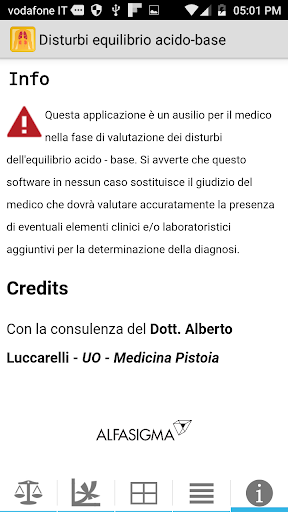 Avvertenza: l’applicazione è un ausilio per il medico nella fase di valutazione dei disturbi dell’equilibrio acido – base. Si avverte che questo software in nessun caso sostituisce il giudizio del medico che dovrà valutare accuratamente la presenza di eventuali elementi clinici e/o laboratoristici aggiuntivi per la determinazione della diagnosi.