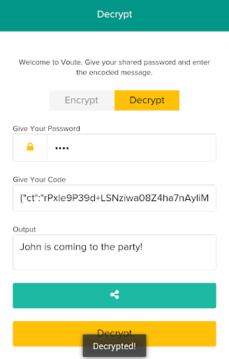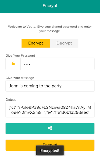 With Voûte, you can encrypt your text data, using NSA approved AES 256 encryption algorithm. You can save the text for yourself or share the secret to your friends. Just make sure you remember the encryption password.